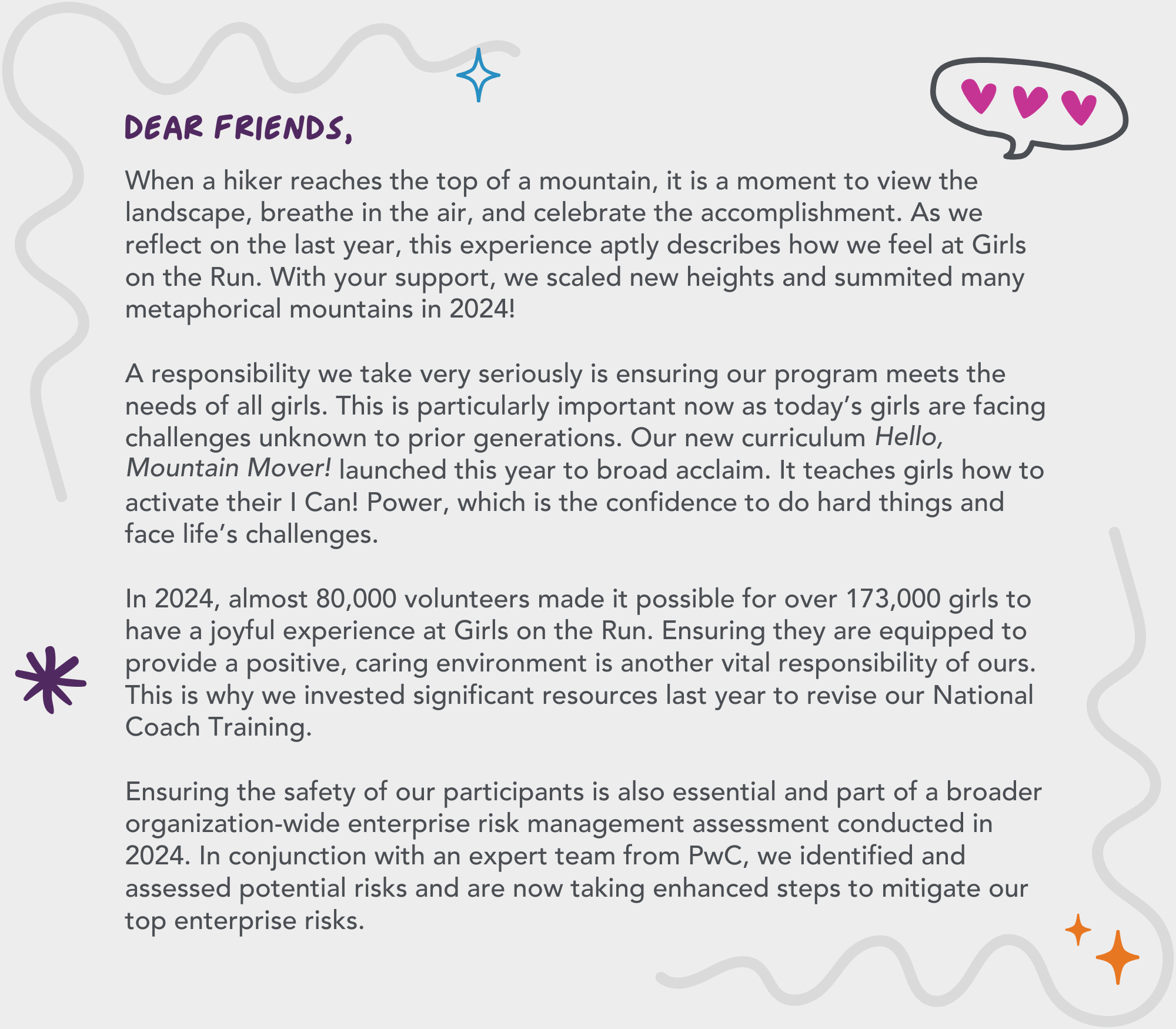 2.5 million girls empowered and counting. Since 1996, Girls on the Run has positively impacted girls, families and volunteer coaches across the country. We recognize our power and responsibility to be intentional in our decision making, therefore we are transparent with donations, grants and other financial information.